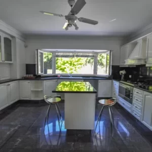 Planta Baja: Hall de recepción con pisos de mármol. Living y comedor apaisados con las mejores vistas al jardín. Escritorio, conectado al living. Toilette. Cocina impecable! con isla, comedor diario y Family. Jardín de invierno tipo quincho con parrilla. Baño de pileta. Muy lindo jardín parquizado con pileta climatizada y riego por aspersión.